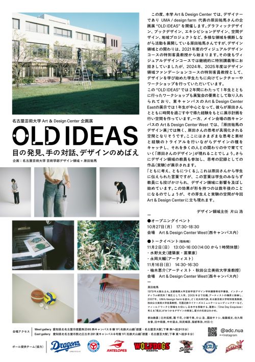 この度、本学Art & Design Centerでは、デザイナーでありUMA / design farm代表の原田祐馬さんの企画展 “OLD IDEAS” を開催します。グラフィックデザイン、ブックデザイン、エキシビションデザイン、空間デザイン、地域プロジェクトなど、多様な領域を横断しながら活動を展開している原田祐馬さんですが、デザイン領域との関わりは、2021年度のヴィジュアルデザインコースの特別客員教授から始まります。その後もヴィジュアルデザインコースでは継続的に特別講義等にお招きしていましたが、2024年、2025年度はデザイン領域ファンデーションコースの特別客員教授として、デザインを学び始めた学生たちに向けてレクチャーやワークショップを行っていただいています。